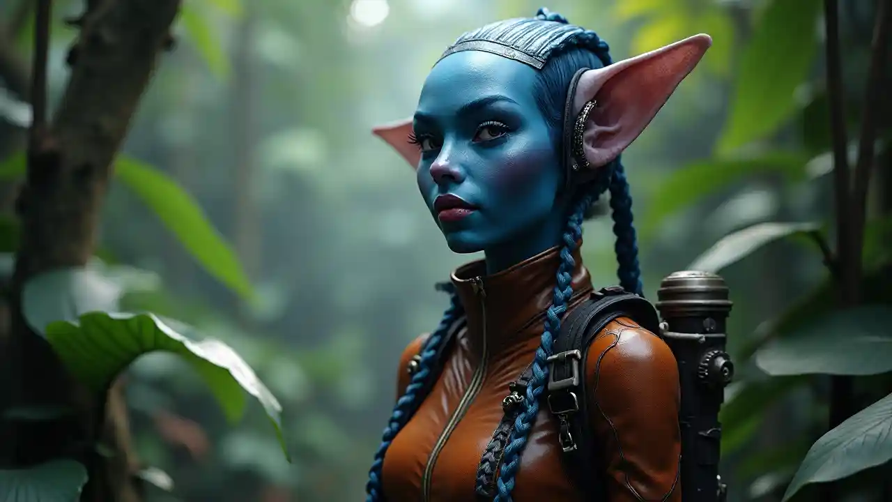 Star Wars mujer twi 'lek de piel azul, cola larga, chaqueta de piloto, fondo de selva tropical