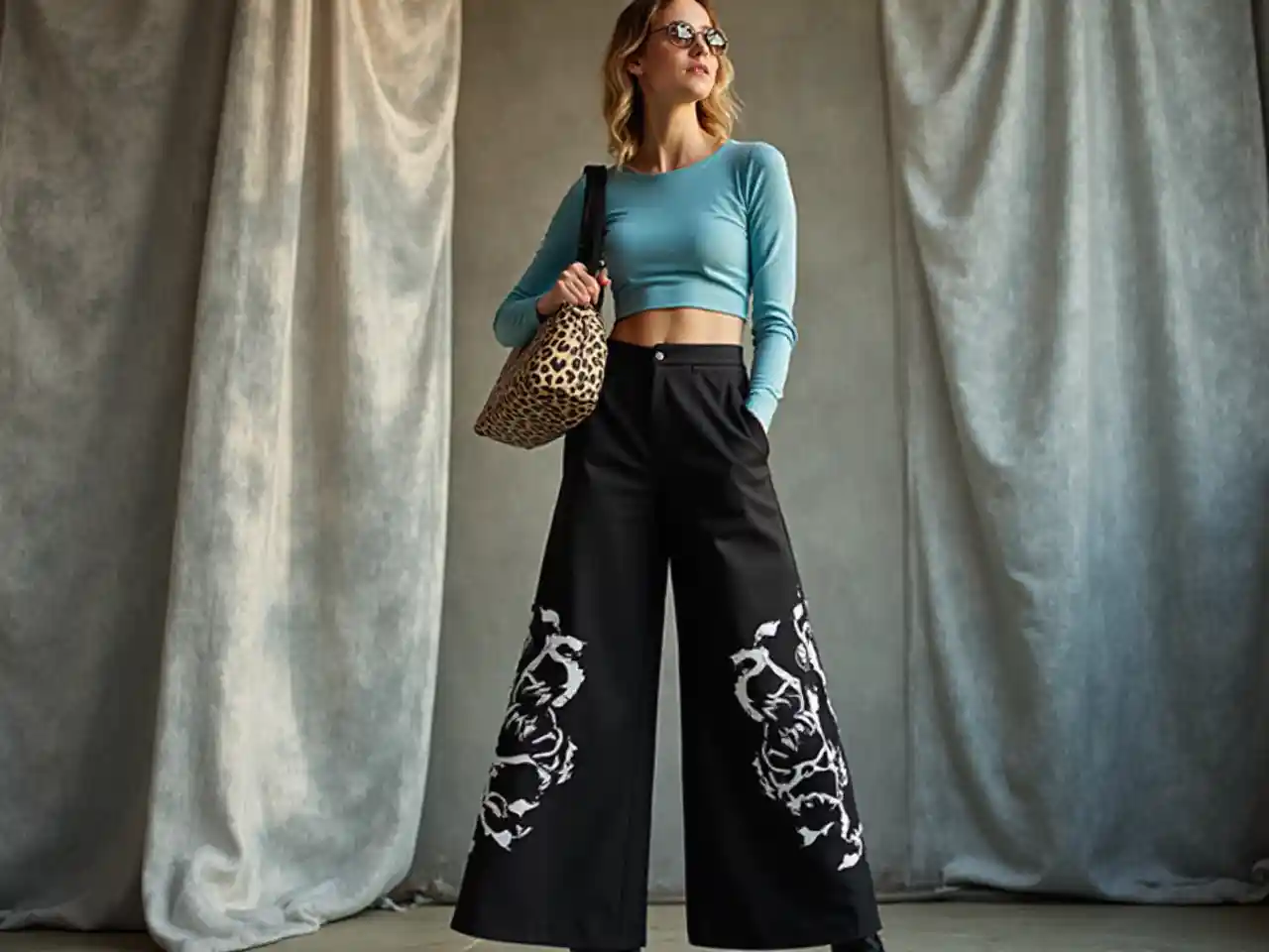 Un individuo de moda avanzada muestra un atuendo vanguardista en un entorno interior contemporáneo, destacando los audaces pantalones negros de pierna ancha adornados con intrincados diseños gráficos blancos. La persona combina estos llamativos pantalones con un crop top de manga larga azul claro ajustado, complementando su apariencia con una bolsa de mano con estampado de leopardo de moda colgada casualmente sobre un hombro. El entorno presenta un fondo gris texturizado con cortinas metálicas brillantes, lo que otorga una calidad dinámica a la composición. La cálida luz natural baña la escena, mejorando el contraste vibrante entre los pantalones oscuros y los tonos suaves de la parte superior, evocando un ambiente moderno y urbano rico en energía y estilo juvenil.