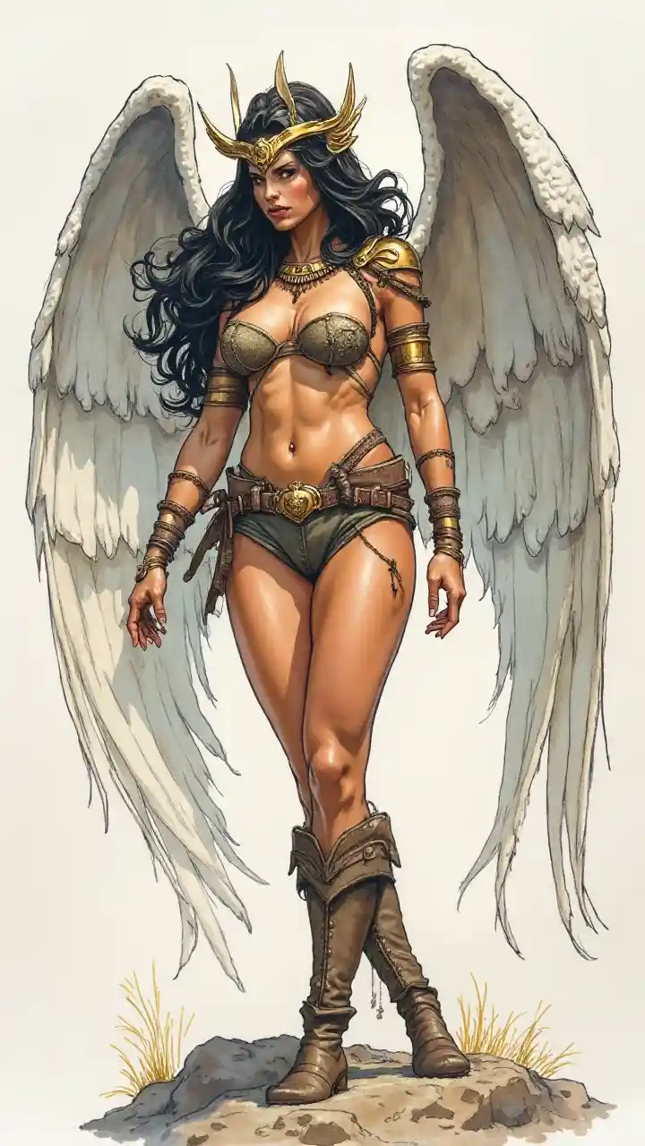 IsaiahArte acuarela. Arte de los cómics, estilo Frank Frazetta Retrato de Valquiria (cuerpo entero, piernas llenas, pies llenos)