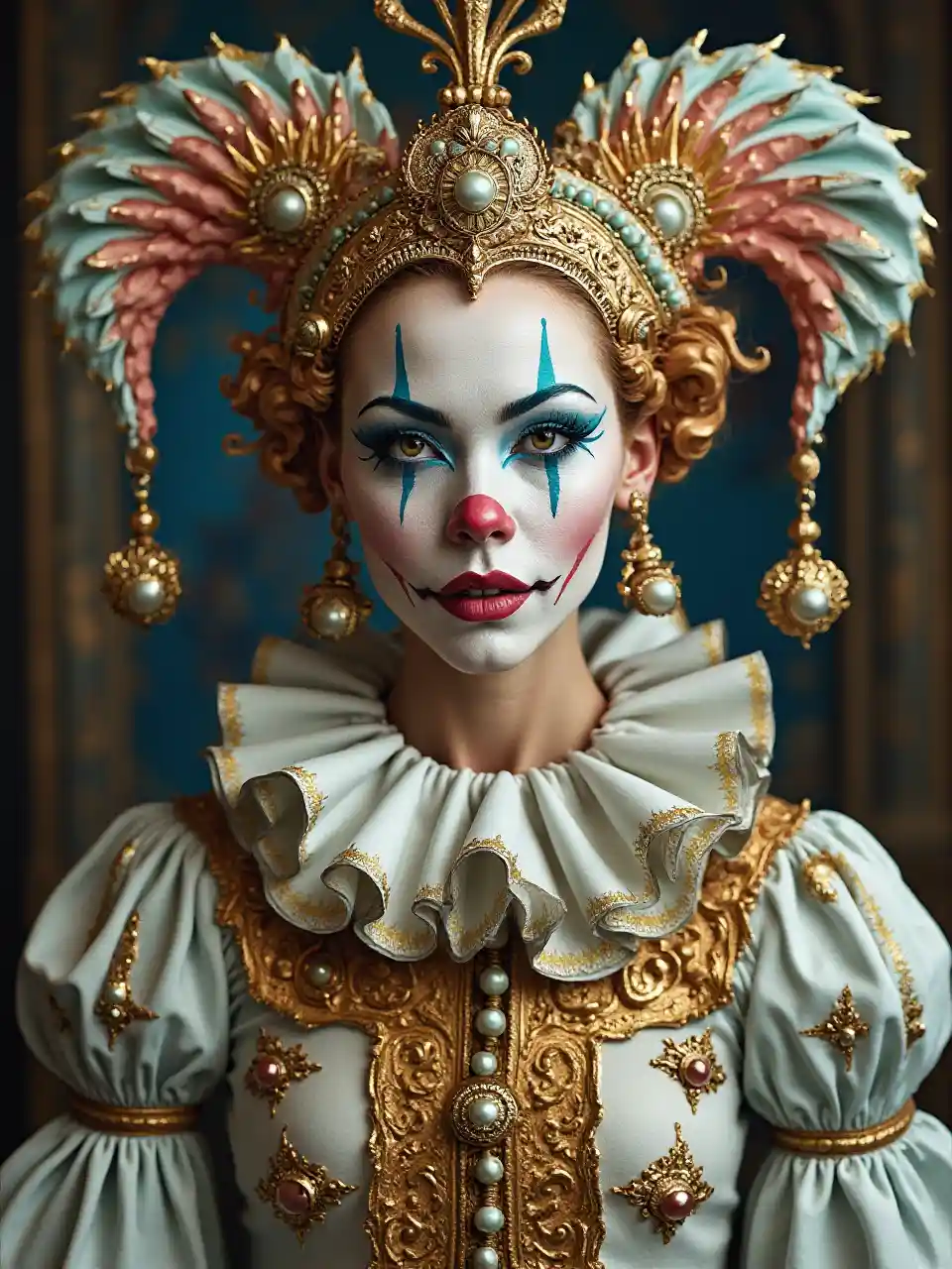 Retrato épico del payaso femenino de cuerpo completo arlequín veneciano en pasteles y adornos intrincados de oro y patrones y diseños geométricos, alta definición, fotografía, retrato cinematográfico, detallado de personajes, entorno detallado e intrincado, brisa fuerte, nevus bajo el ojo izquierdo, entorno detallado e intrincado, técnica de tinta de alcohol