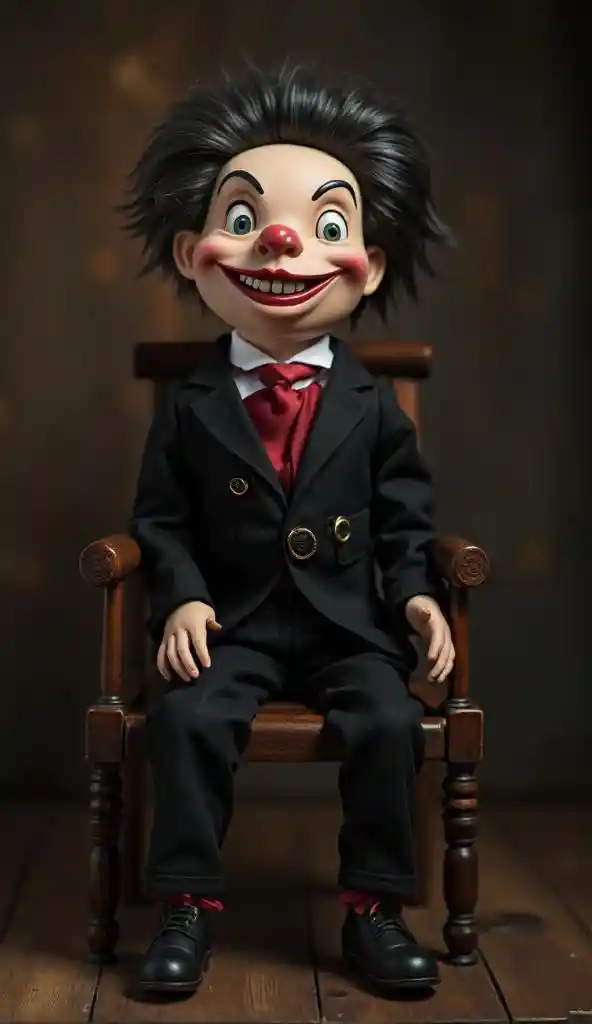 ANNAUn ventrílocuo clásico, vestido con un pequeño traje negro y una corbata roja, sentado en una vieja silla de madera. La muñeca tiene una sonrisa enigmática y profunda, olhos fixos, cre