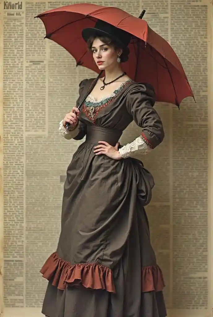 Una mujer victoriana, con un paraguas pose frente a un periódico de moda de la década de 1800