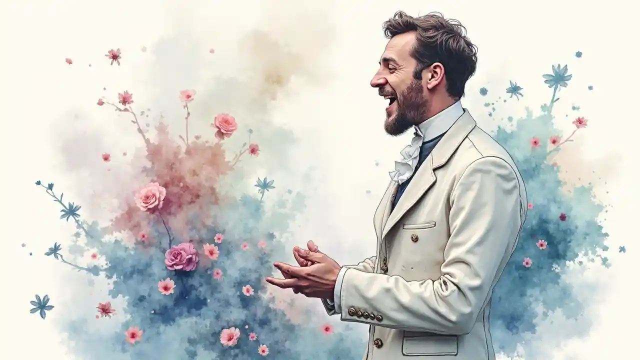 Una obra de arte fascinante que presenta a un divertido caballero victoriano en un perfil lateral rodeado de efectos de acuarela y un espacio en blanco dinámico. Los elementos de las técnicas de acuarela se mezclan elegantemente con trazos expresivos y una delicada paleta de colores. La imagen transmite una belleza caótica y una maravilla cinematográfica con un fondo suave.