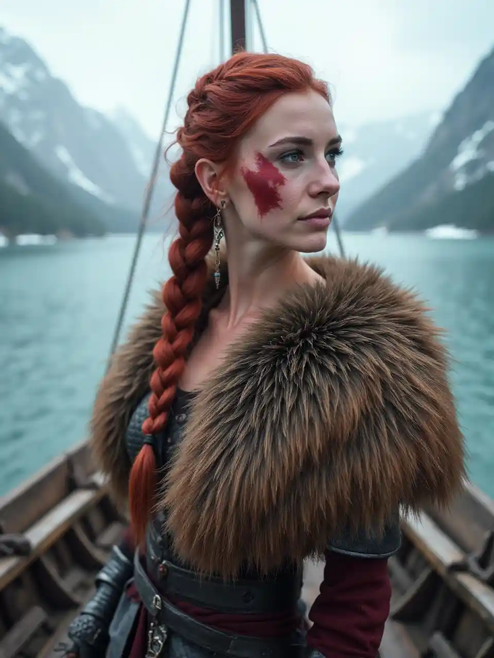 Una mujer vikinga con cabello rojo trenzado en una trenza, con una armadura reveladora y una piel de oso cálida en los hombros, su rostro pintado de rojo con pintura de guerra, se encuentra en la proa de un barco vikingo largo de madera, en la distancia se pueden ver hermosas montañas nevadas envueltas en niebla
