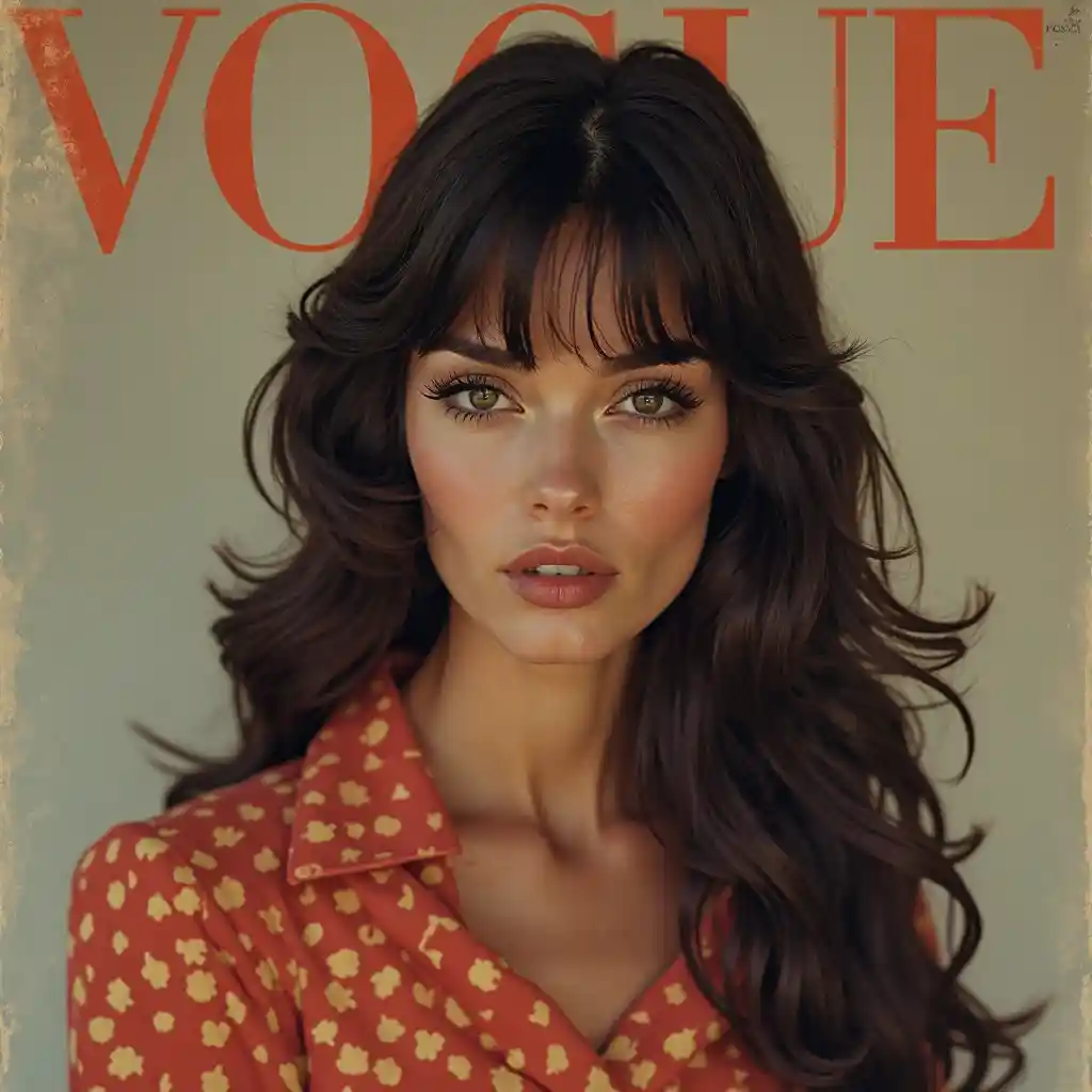 70's moda retrato portada revista "vogue" lujo vintage retro futuro tema agudo color wes anderson estilo Retrato de una mujer con el pelo negro, estilo de la guerra de las galaxias