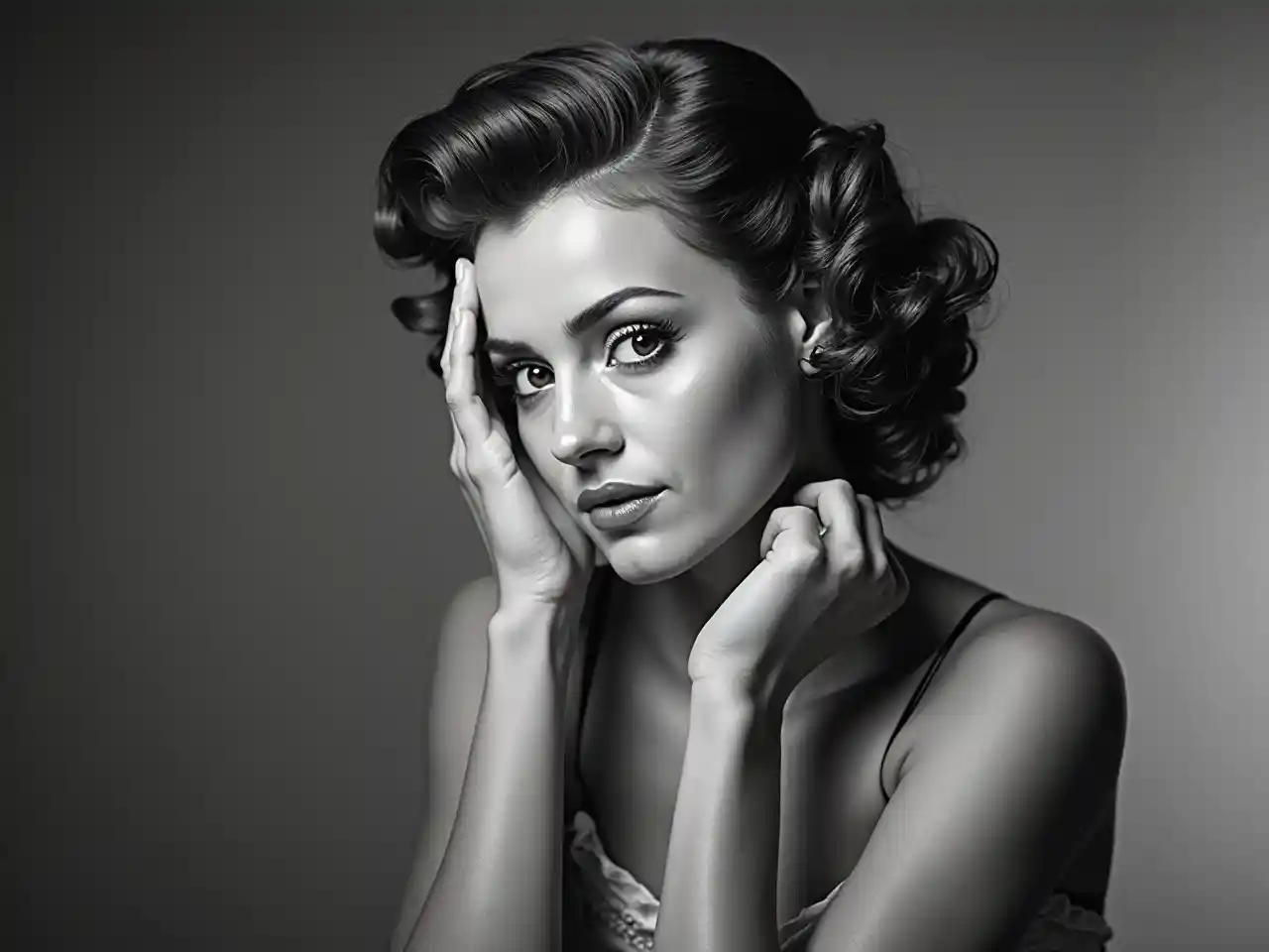 Una imitación del glamuroso look fotográfico de los años 50 o 60. El peinado, el maquillaje y la pose del sujeto son consistentes con esa época, y el hecho de que la foto sea en blanco y negro refuerza la sensación clásica.
