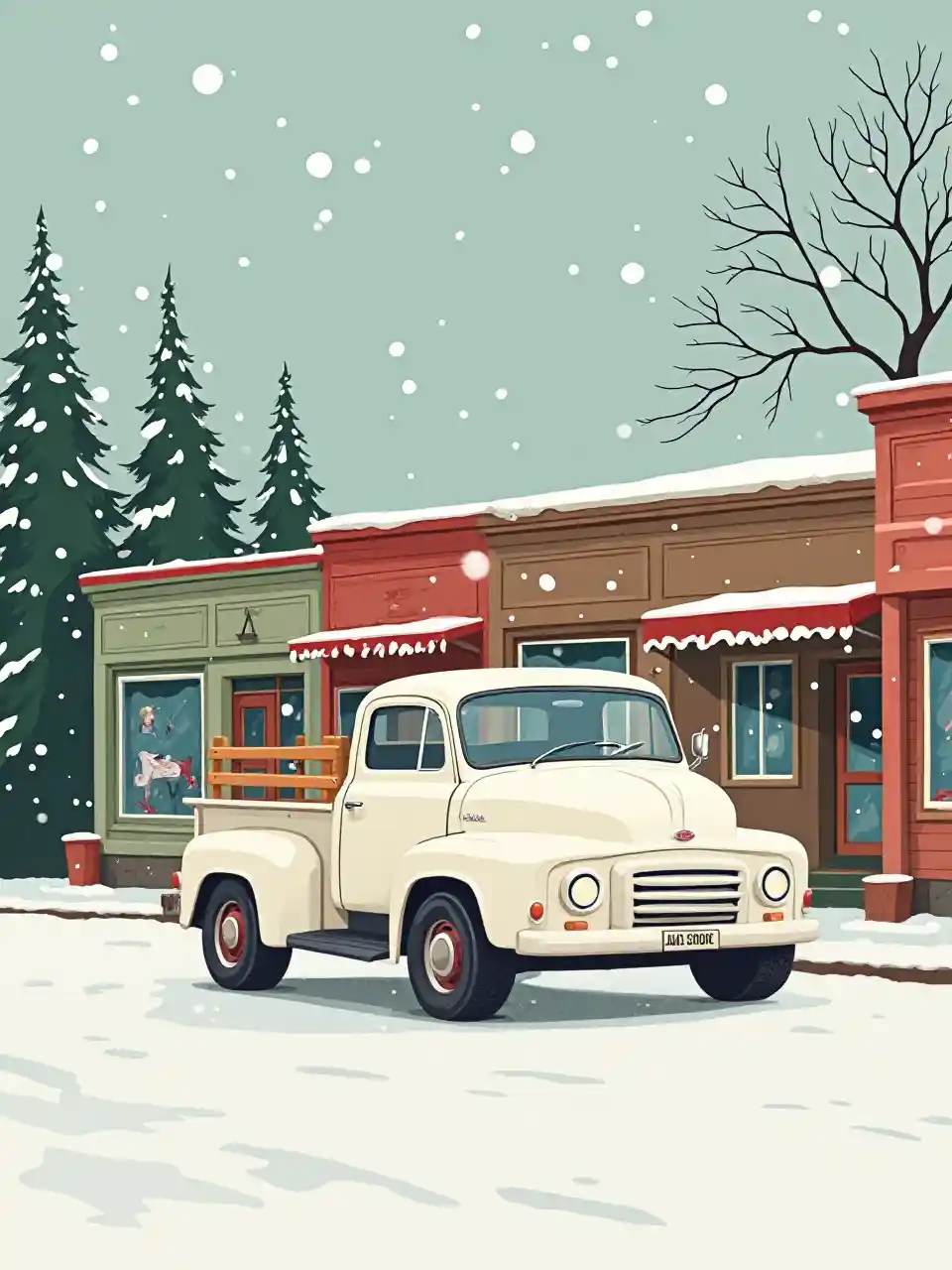 OliviaUna simple ilustración del estilo de una tarjeta de Navidad plana de una camioneta blanca Ford 1950 en la nieve estacionada frente a una fila de tiendas