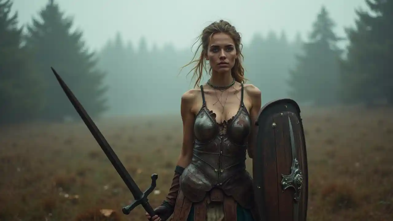 Campo de batalla, mujer soldado romana, pequeña armadura, sexy, fuerte, niebla, tierra, bosque, real, cuerpo completo, espada, escudo, cicatrices, cortes, tetona, piel expuesta, sexual, armadura rota
