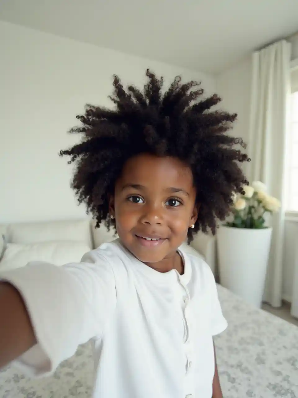 Aubreyojo de pez, foto selfie de niño negro rizado con traje blanco, habitación blanca, muebles blancos, flores blancas