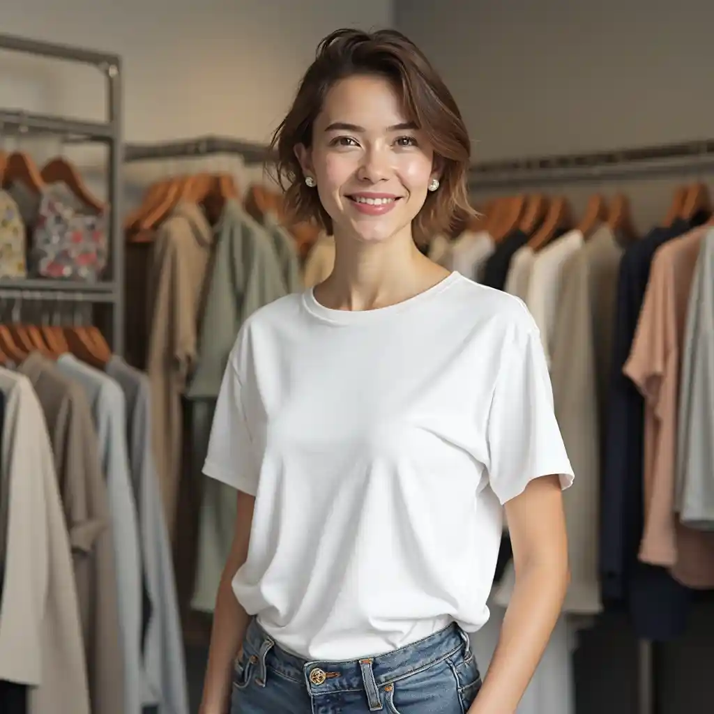 ColtonMujer con una camiseta blanca en blanco en la maqueta de una tienda de ropa