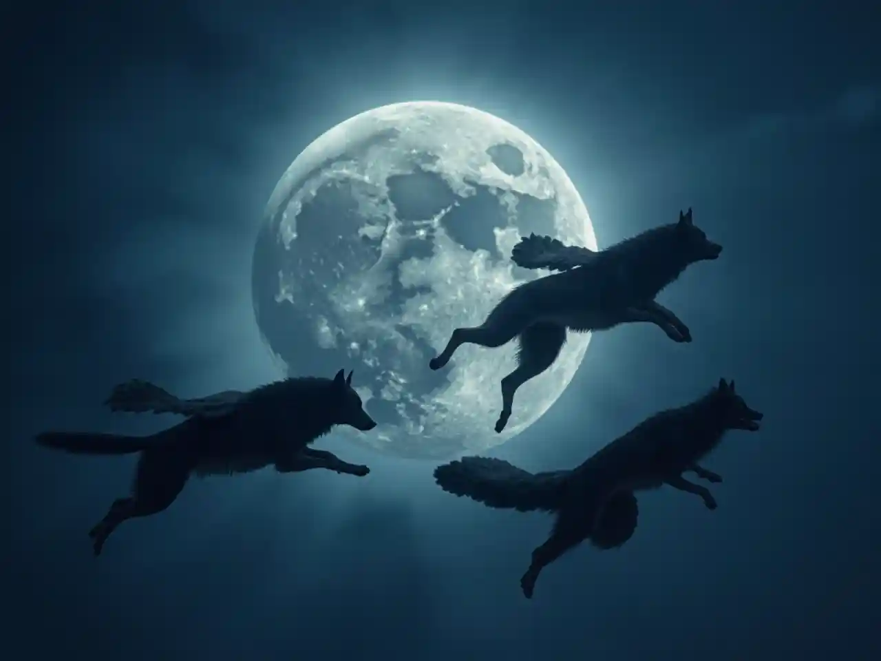 3 lobos voladores con alas que vuelan alrededor de la luna en un cielo oscuro iluminado por la luna por la noche