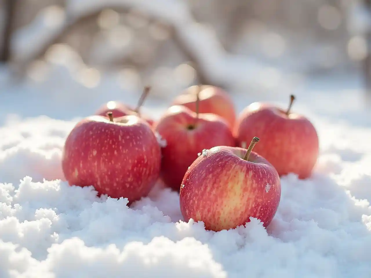 Manzanas en la nieve Primer plano Día soleado de invierno