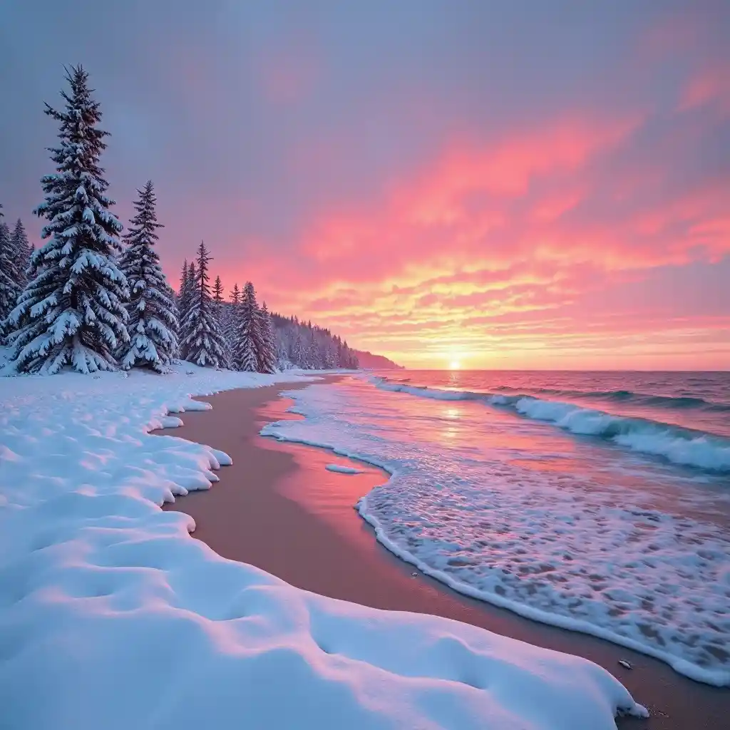 Una impresionante escena de playa de invierno con nieve y atardecer