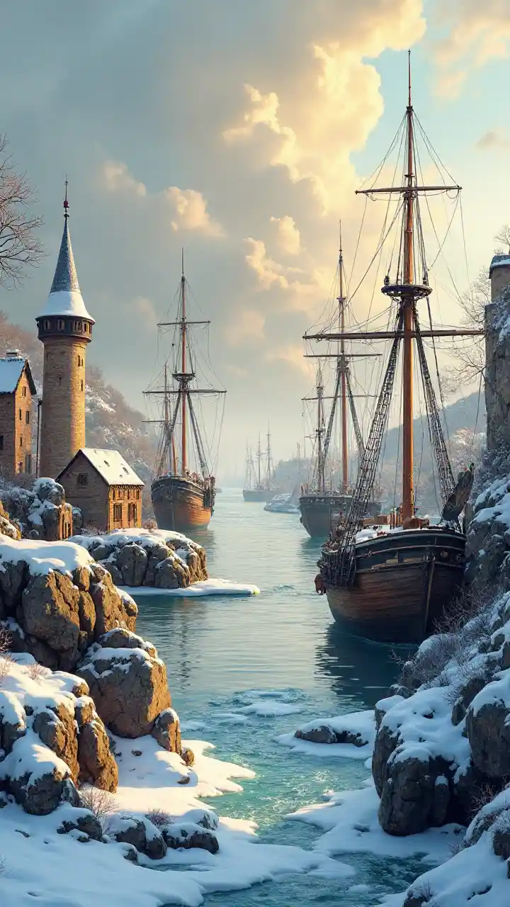 Vista de la costa, (puerto de fantasía medieval en invierno), (dibujo a lápiz), barcos elegantes y detallados atracados en un astillero nevado y cubierto de hielo, intrincados elementos de Anton Pieck, nubes doradas que proyectan un cálido resplandor sobre la escena, sombras suaves, pintoresco ambiente invernal, alta profundidad, paisajes ultra detallados y encantadores, evocando nostalgia y magia.