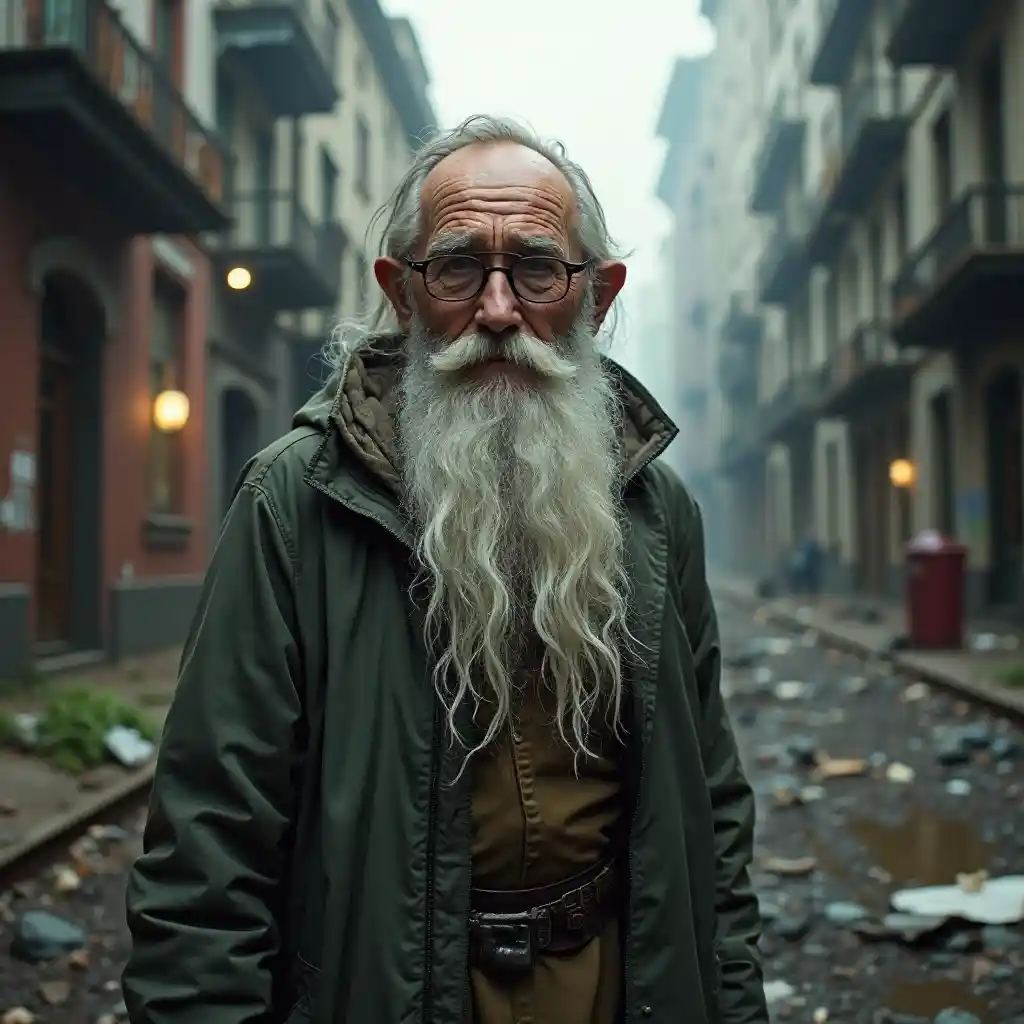 Un anciano de aspecto sabio con gafas y larga barba blanca. Asegúrese de que tiene un paquete de seis y está en una ciudad abandonada cerca de una alcantarilla masiva