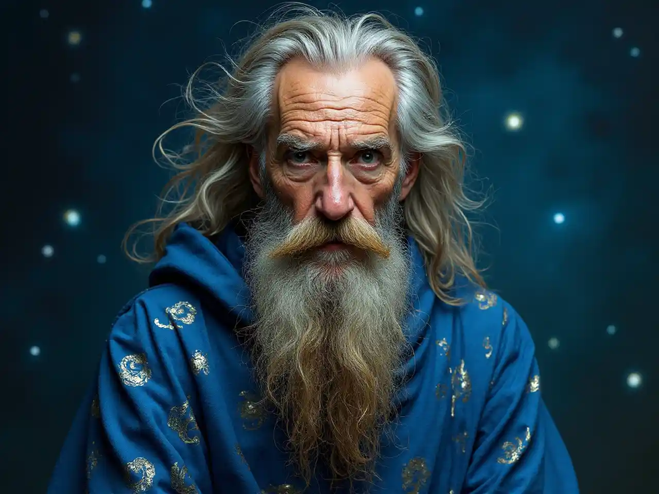 Imagina a un mago de mediana edad con una barba desaliñada y un cabello salvaje y expresivo, que recuerda a los autorretratos de Vincent Van Gogh. Lleva una túnica azul que fluye adornada con intrincados patrones de plata que brillan débilmente, lo que sugiere propiedades mágicas. Sus ojos son brillantes e intensos, reflejando sabiduría y excentricidad. El fondo podría ser un cielo nocturno estrellado, mejorando la atmósfera mística.
