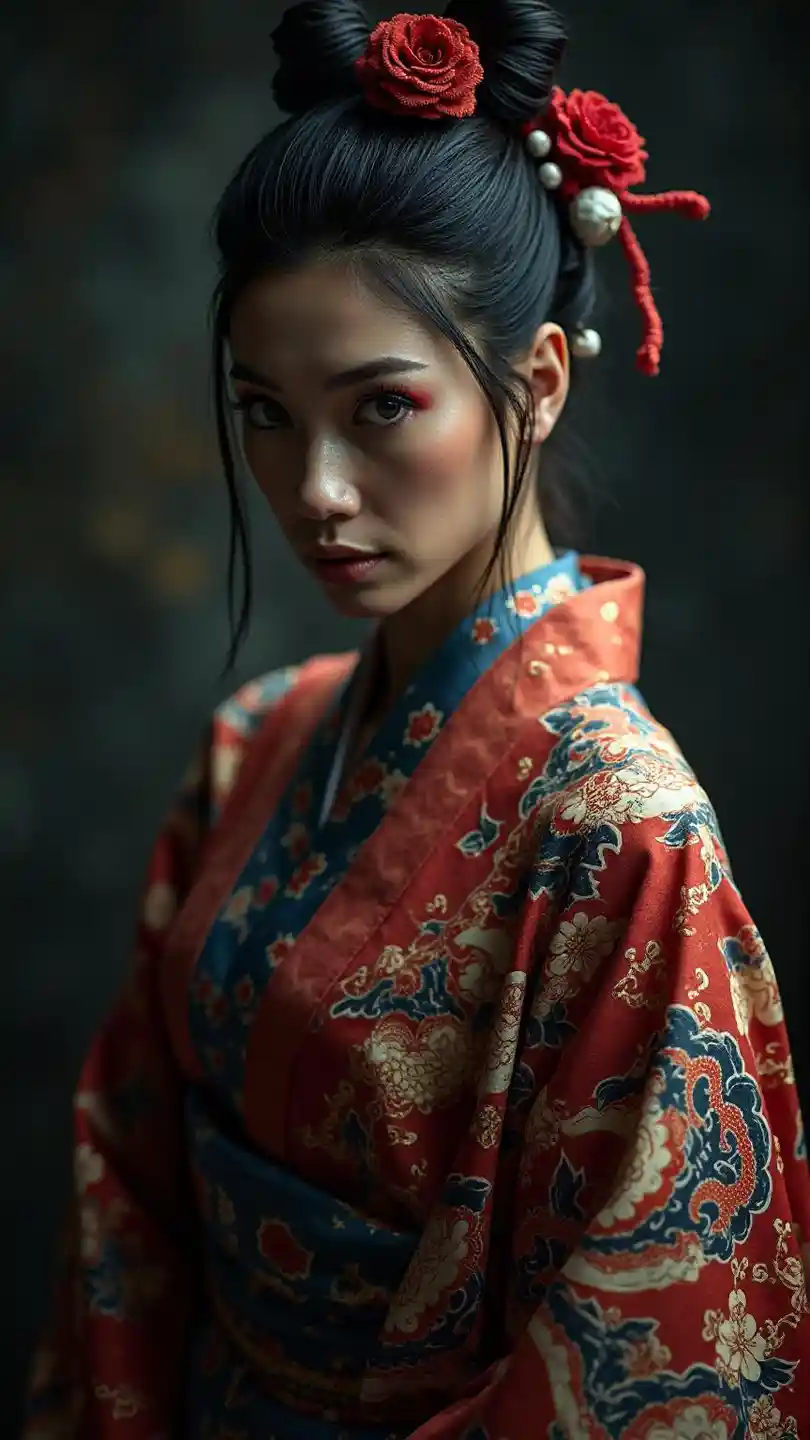 Una mujer con un exquisito kimono, parece una yakuza con un tatuaje de dragón, atmósfera abrumadora, brillo brillante, tono oscuro, iluminación dramática, b borrosa