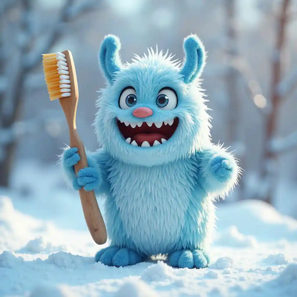 Un lujoso personaje de dibujos animados de yeti feliz en 3D que sostiene un gran cepillo de dientes en la nieve, monstruos y co, ultra detallados, ojos diminutos