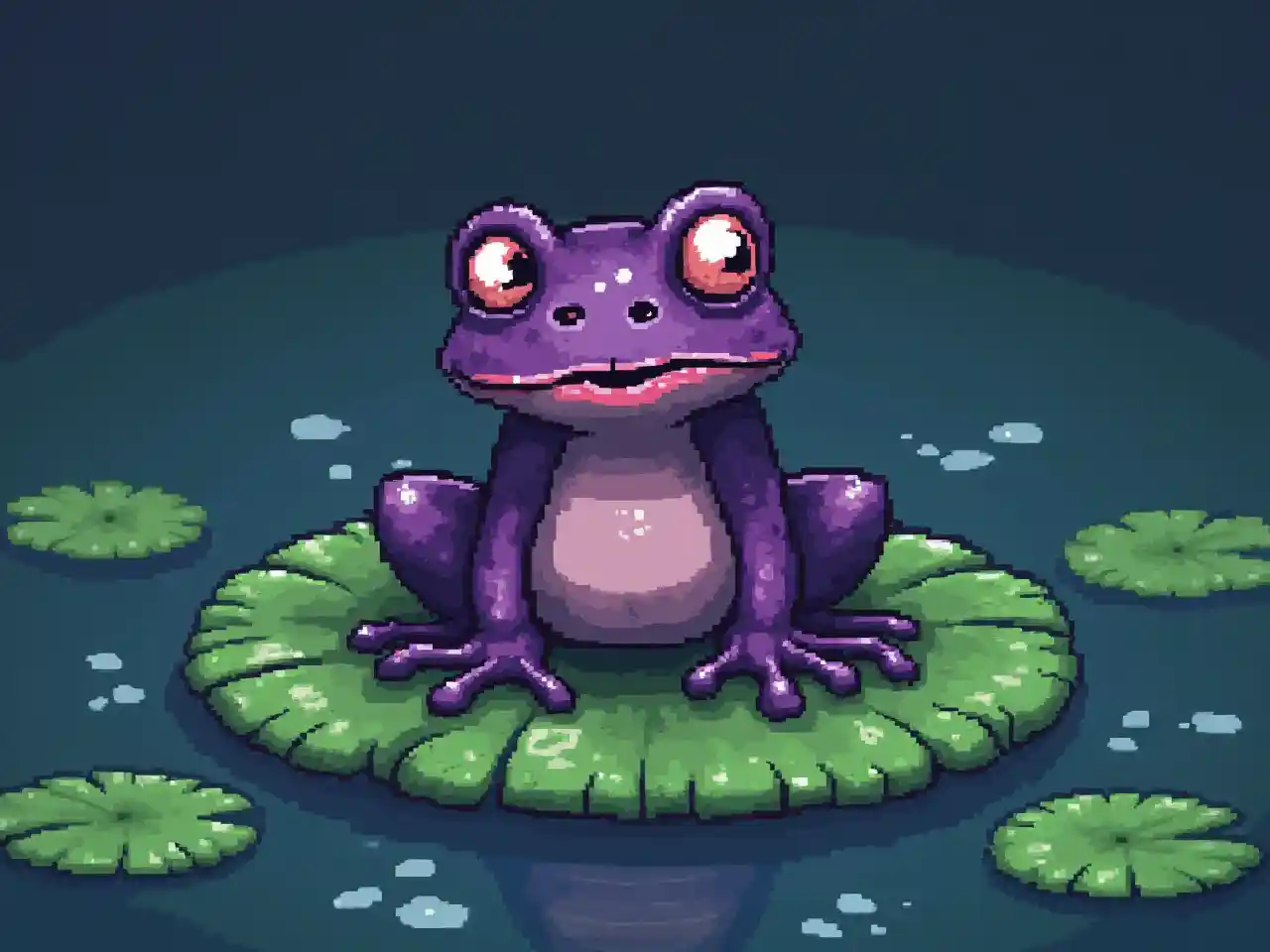 EastonArte de píxeles de 16 bits de una espeluznante rana zombi púrpura en una almohadilla de lirios verdes
