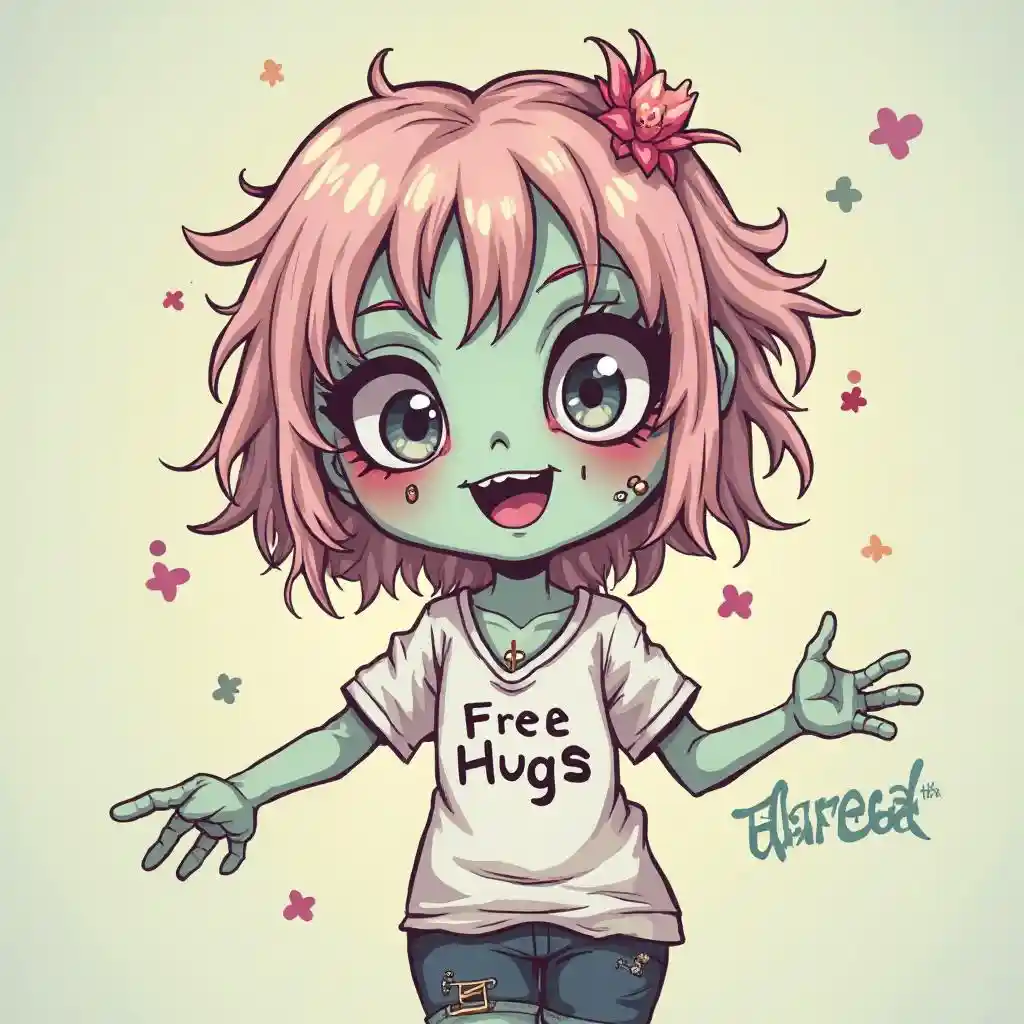 Chica zombie de estilo anime en 2D, grandes ojos expresivos, un poco decaído pero aún lindo, cabello desordenado en tonos pastel, con una camiseta rasgada con 'Abrazos gratis' escrito en ella. Los brazos estirados hacia adelante, ofreciendo un abrazo, dulce sonrisa inocente. Aspecto plano, dibujado a mano, fondo colorido y suave, ambiente kawaii pero espeluznante, juguetón y acogedor ".