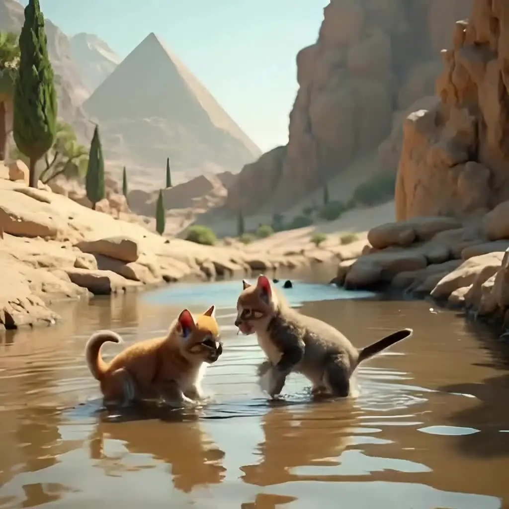 Dos adorables gatitos animados están chapoteando en aguas poco profundas, ¡dando un giro encantador a la escena clásica! Con la magia de la IA, estas guapas felinas ahora pueden sincronizar los labios con melodías pegadizas y diálogos divertidos, haciendo que cada momento sea más entretenido. Imagínese a un gatito tratando de cantar una canción pop, su pequeña boca moviéndose perfectamente en sincronía con la letra, mientras que el otro mira con ojos amplios y asombrados. La pirámide y los acantilados rocosos en el fondo agregan un ambiente de aventura épica, ¡como si fueran estrellas del mundo del espectáculo en un gran escenario! Ya sea para una publicación divertida en las redes sociales, un mensaje de video divertido o simplemente para alegrar el día de alguien, estos gatitos tienen el encanto y las habilidades para capturar corazones. ¡Prepárate para una experiencia de entretenimiento que seguramente traerá una sonrisa a la cara de cualquiera!