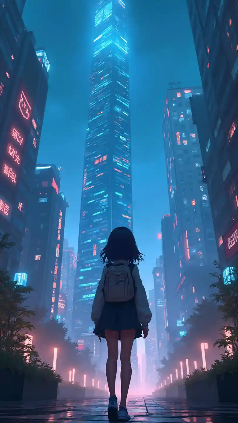 شهر سایبری، تکنولوژی بالا، پس زمینه یک آسمان خراش و یک آینده شناس در یک بعد متفاوت است که غیر ارگانیک اما با نور تزئین شده، دبیرستان، فو