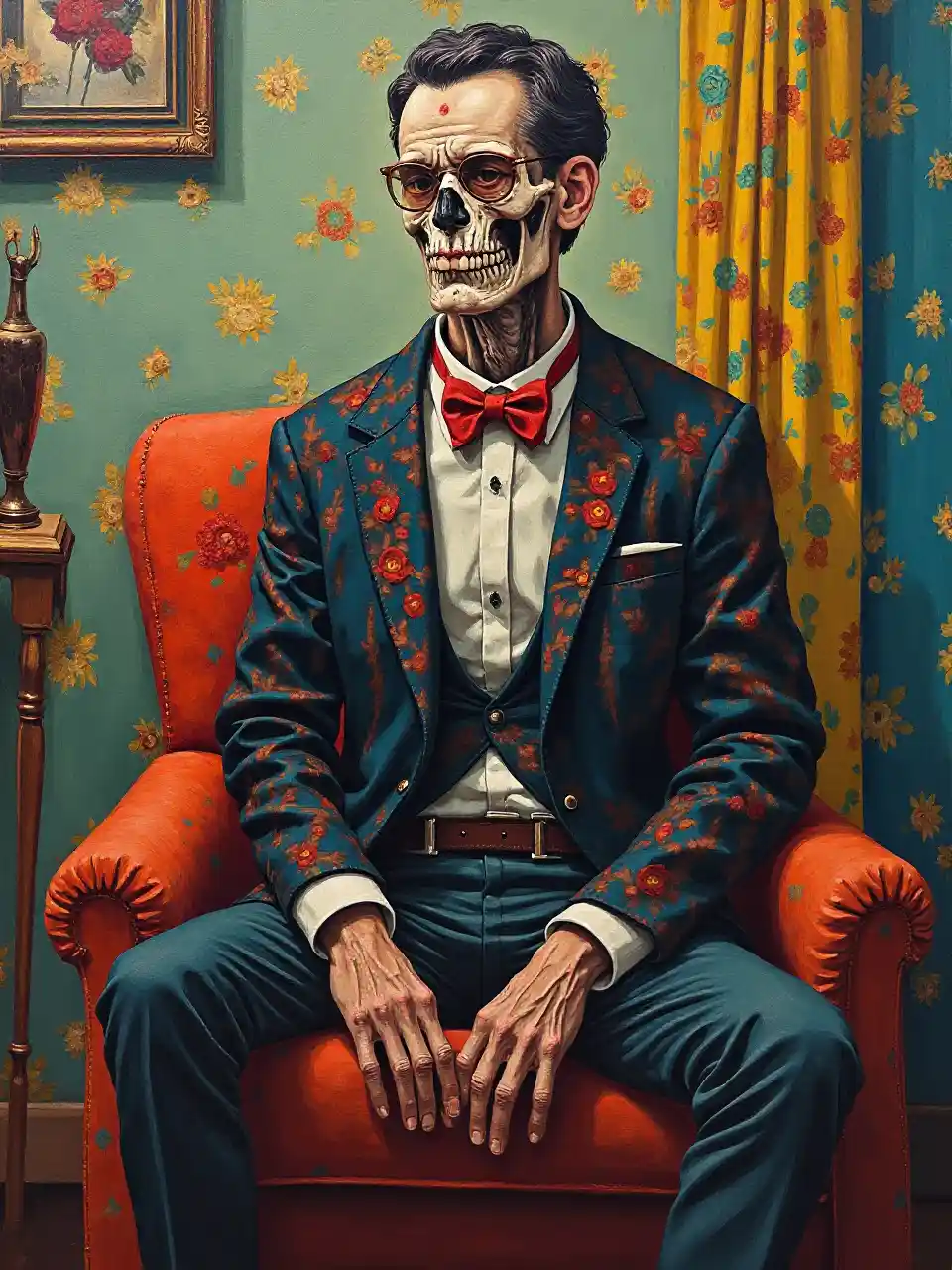 مردي که بدهي به مرگ گرفت، سبک کاترين نولين، نقاشی، آکریلیک، روغن، پرتره، داخلی، ایالات متحده