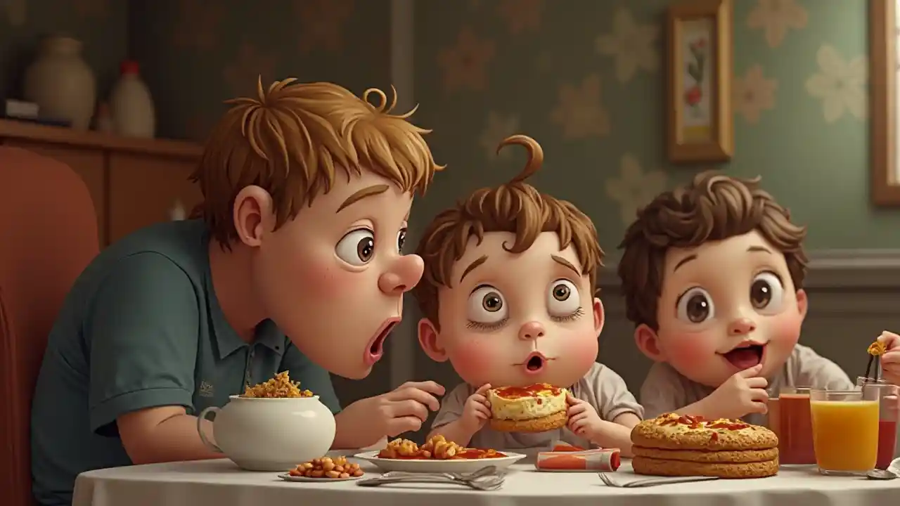 تصويري از يه بچه که يه خيار ميخوره و داره به ياد مياره که نزديکشه رو درست کن، چند نفر بزرگ که اومدن به اين