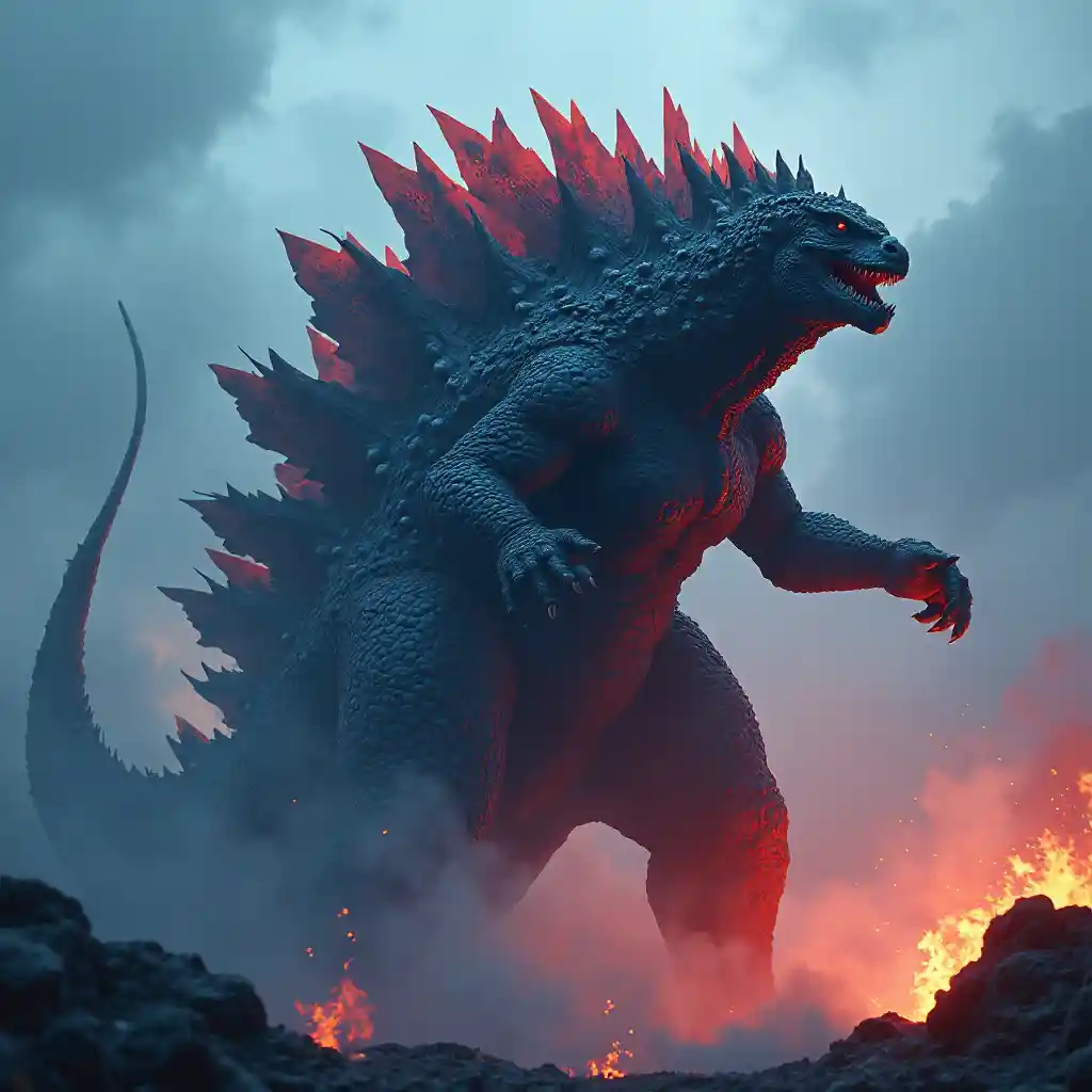 گودزيلا بزرگ با آتش آبي قرمز مخلوط نگاه خطرناک