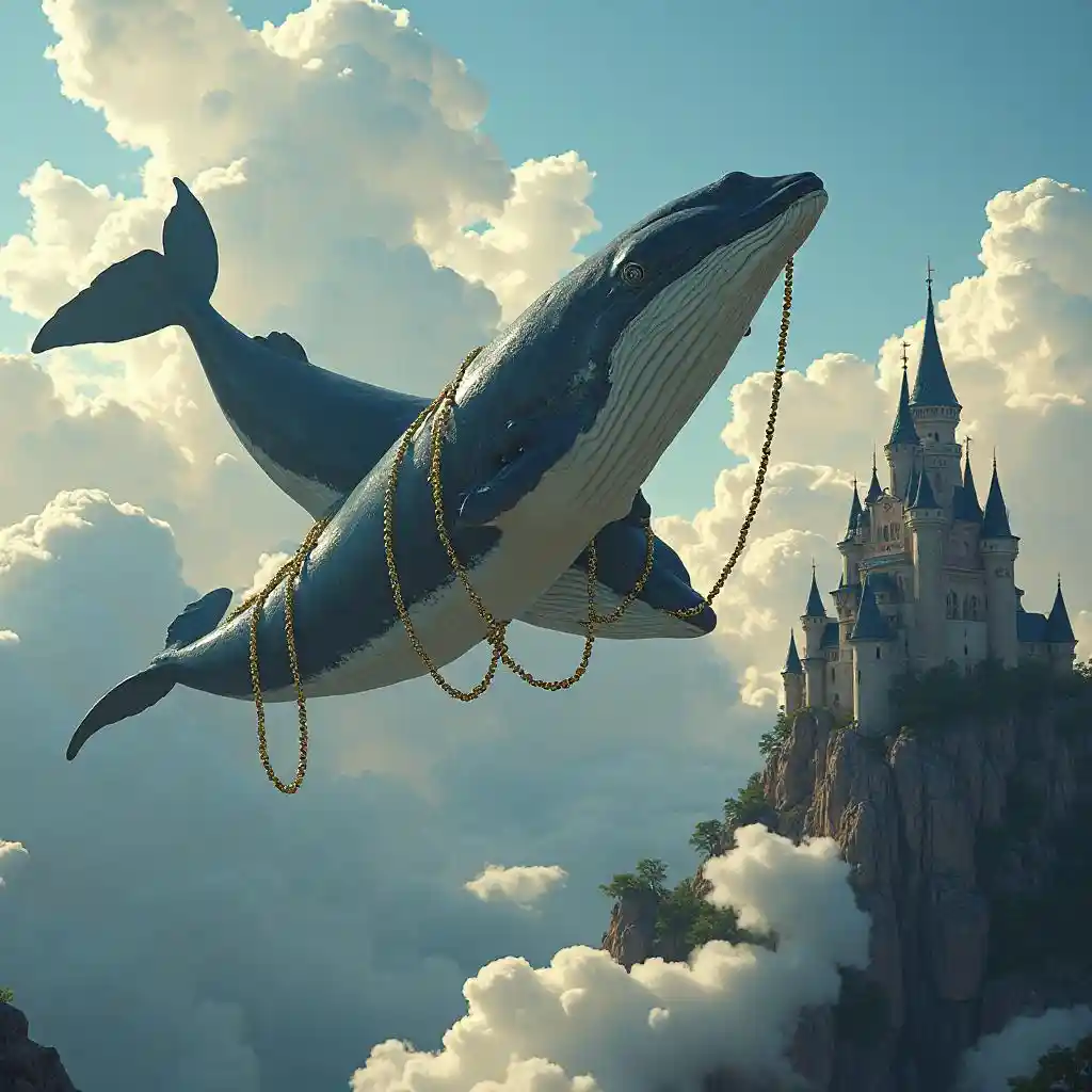 Adalynدو نهنگ که در زنجیرهای طلایی پیچیده اند، از میان ابرهای متحرک پرواز می کنند، در کنار یک قلعه در بالای کوه
