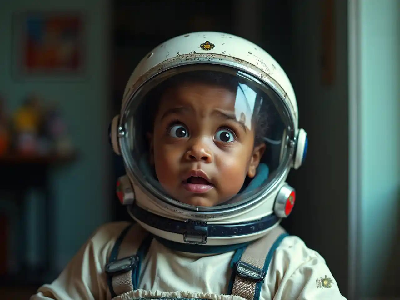 يه بچه با لباس فضايي با يه نگاه شگفت زده روي صورتش، يک کپي توسط استوکي وبستر، در CG Society، Afrofuturism، Sense of Awe، UHD Image، Behance HD