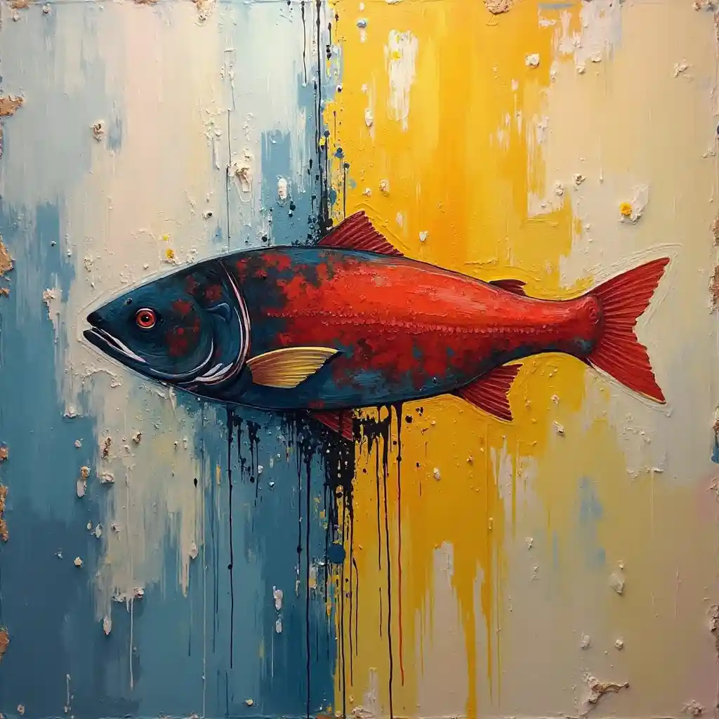 Van der Rohe -tyyli, abstrakti ekspressionismi. Puolipuolinen Big Flat Fish pää tulee ylhäältä, 2D-kuva, Punainen Sininen Keltainen on hallitseva värit, tausta on jaettu suuria eri kokoisia pastellivärit, tekstuurinen isku maalia tippaamalla ja piiskalla intuitiivinen, dramaattinen vastakohta pääkuvan ja taustan välillä, minimalistinen