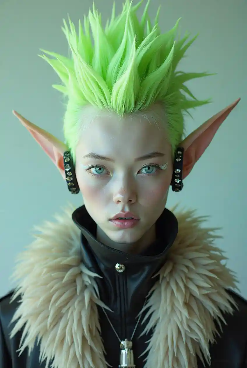 Luokaa tulevaisuuden kuva androgyynistä hahmoa, jolla on eteriä, muukalaista. Hahmon hiukset ovat piikkikas, neonvihreät, poskesi ovat terävät ja hieman nostetut. Silmät ovat suuret, vaaleanpunaiset ja dramaattiset valkoiset silmäkuvat herättävät kaukaisen tunnelman. Korvat ovat pitkiä ja muistuttavat eläinten korvia. Tausta on neutraali, pehmeä harmaa, joka korostaa mallien silmiinpistävää ulkonäköä ja rohkea väripaletti. Valot ovat pehmeitä ja heittävät hienovaraisia varjoja iholle korostaakseen muukalaisen ominaisuuksia. Yhden tyylin tunnelmaa on salaperäinen, jännittävä ja muukalainen