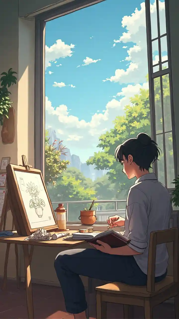 RobinAnime-tyyli, tyttö piirtää jumien muotokuvan suurella taide-aikalla, mies istuu ikkunassa ja katsoo ulos, jolla on albumin ja kyn. Suuren kulman linssi
