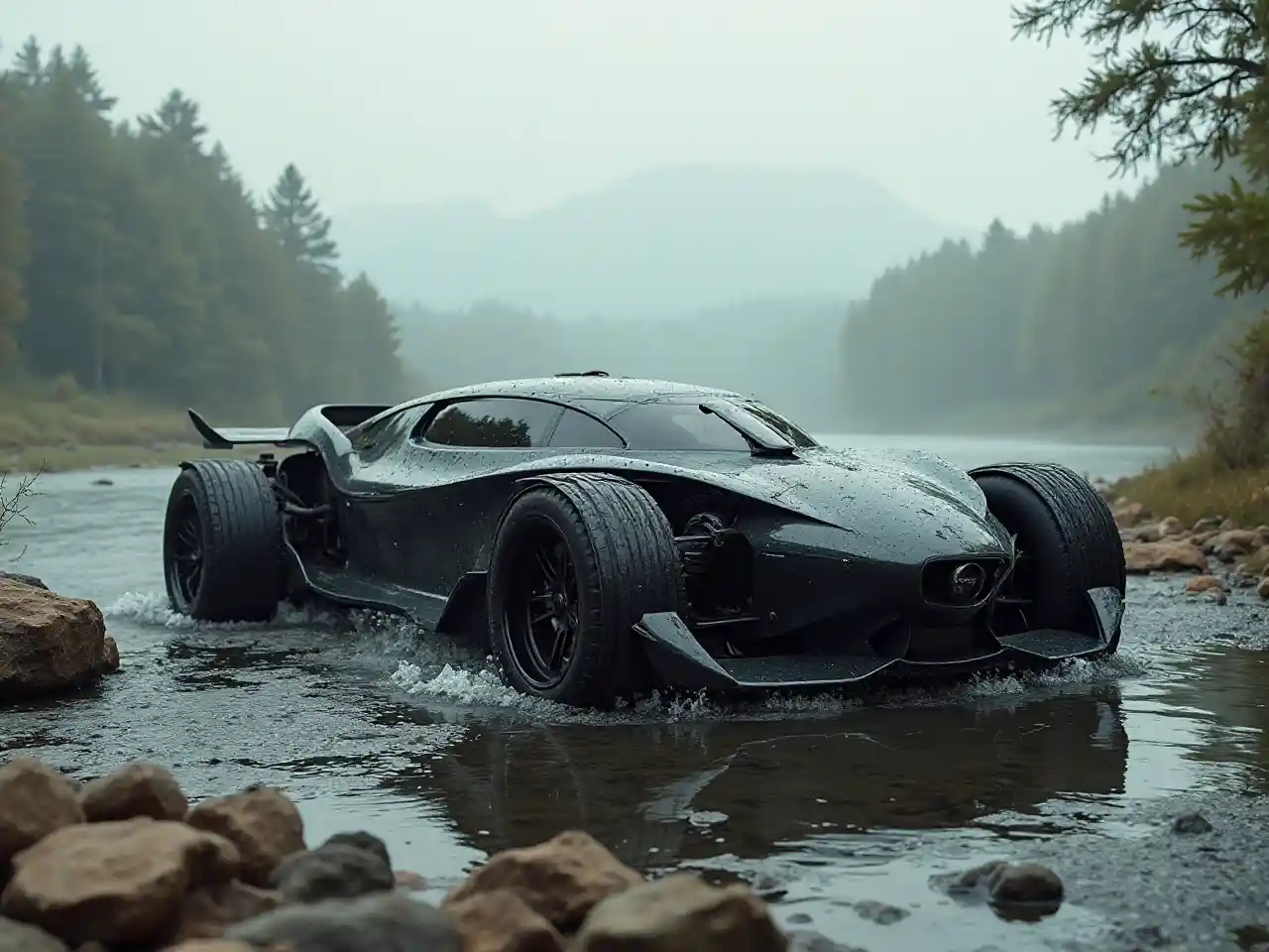 Jacob"Konsepti apokalyptinen tulevaisuus auto Cyborg musta renessanssi ralli kesällä Meleoliitti maisema joki