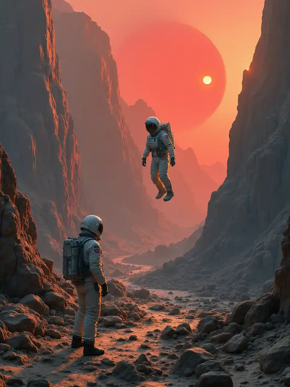 Yksityiskohtaisempi astronautti leijuu ilmassa pienen ja monimutkaisen kiven keskellä vuoristoa punaisella auringonlaskun valolla ja toinen astronautti katsoo häntä maassa.