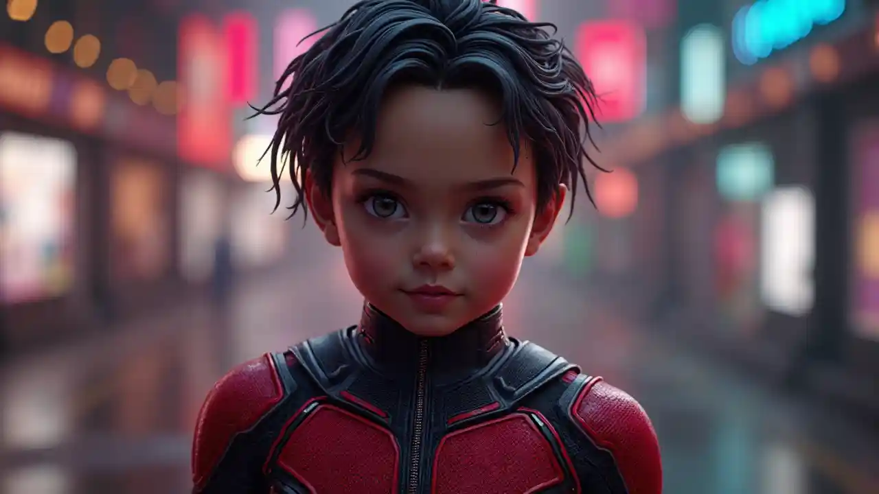 Vauvan versio muurahaismiehestä. Täysi ruumis, musta tukka, kasvot, neonvalot, realistinen, mestariteos