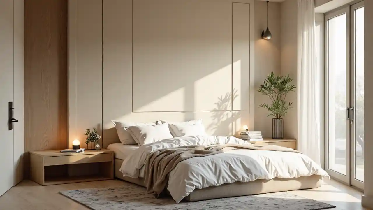 Minimaalinen ammatillinen makuuhuoneen sisustussuunnittelu, - helpotettu kipsi seinät, viihtyisä makuuhuone, pehmeä auringonvalo