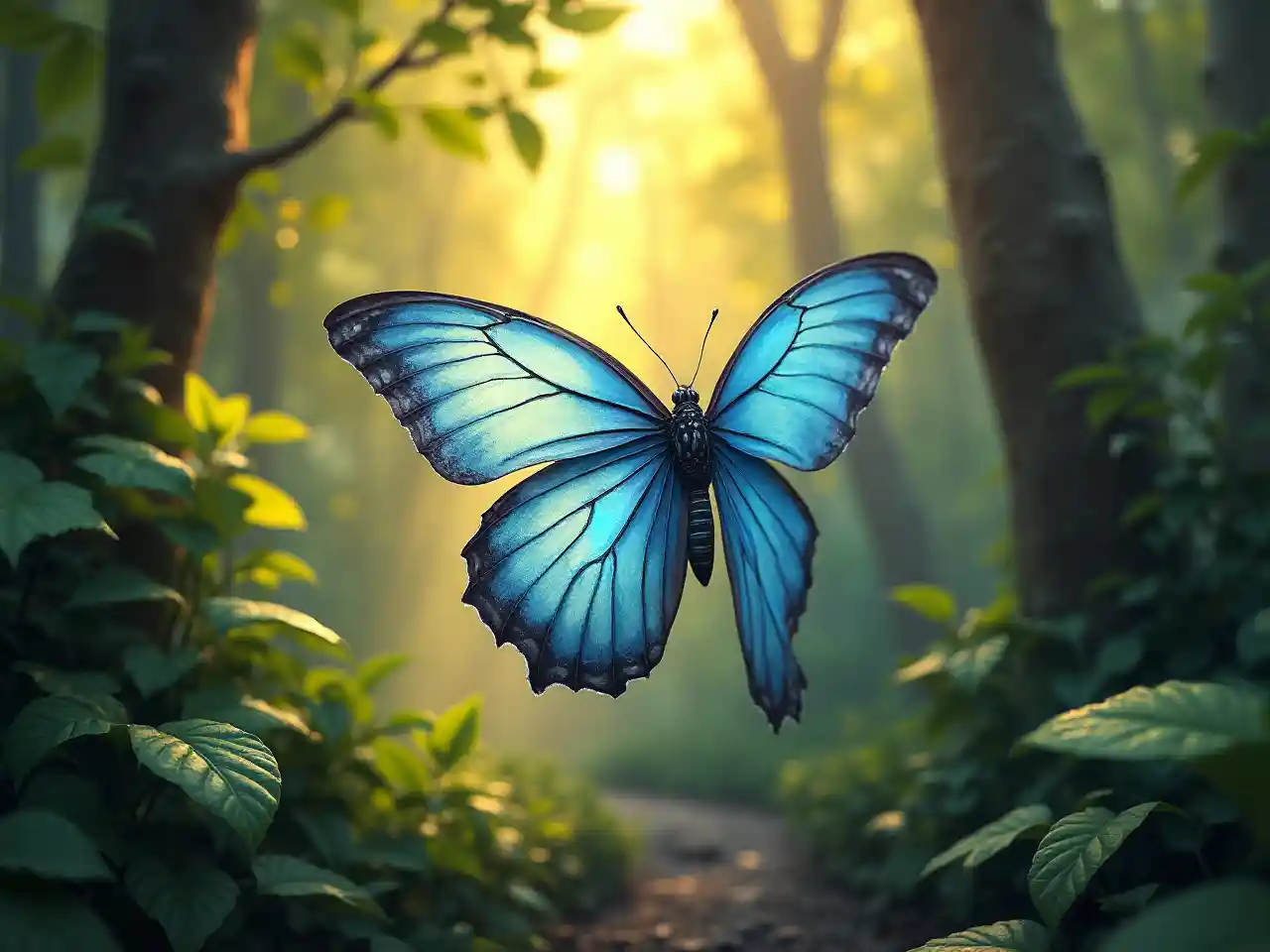 Realistinen sininen perhos lentää hienoin runsailla puilla ja elävällä vihreällä lehdellä, lämmin kultainen auringonvalo virtaa alas ja valaisee hienovaraisia siipiään, lumoava ilmapiiri, mystinen ilmapiiri, joka on innoitettu Anne Stokesista, fantasia-taite, äärimmäisen yksityiskohtainen harrastus, outo rauha, - upea valon ja varjon vuorovaikutus, - rikas tekstuuri, joka parantaa yleistä visuaalista vetoa.