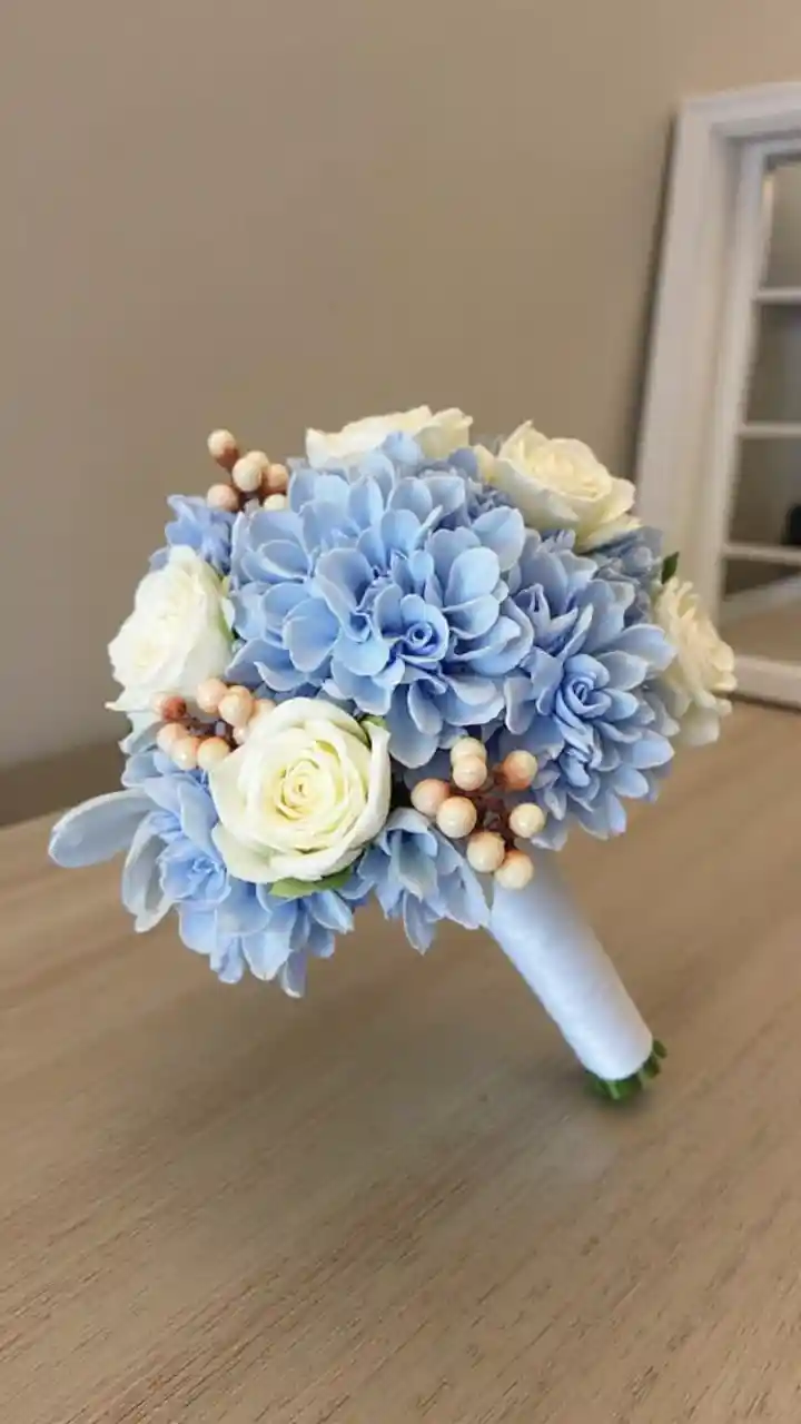 AsherPieni pyöreä hääkukkiainen, jossa on sininen hortensia, muutama valkoinen ruusu ja oranssit marjat