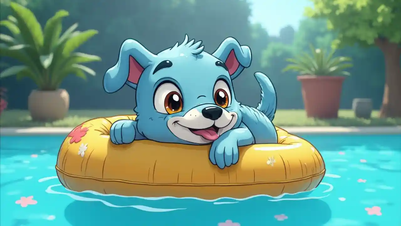 Bluey, piirretty koira, nauttii päivästä altaan vieressä