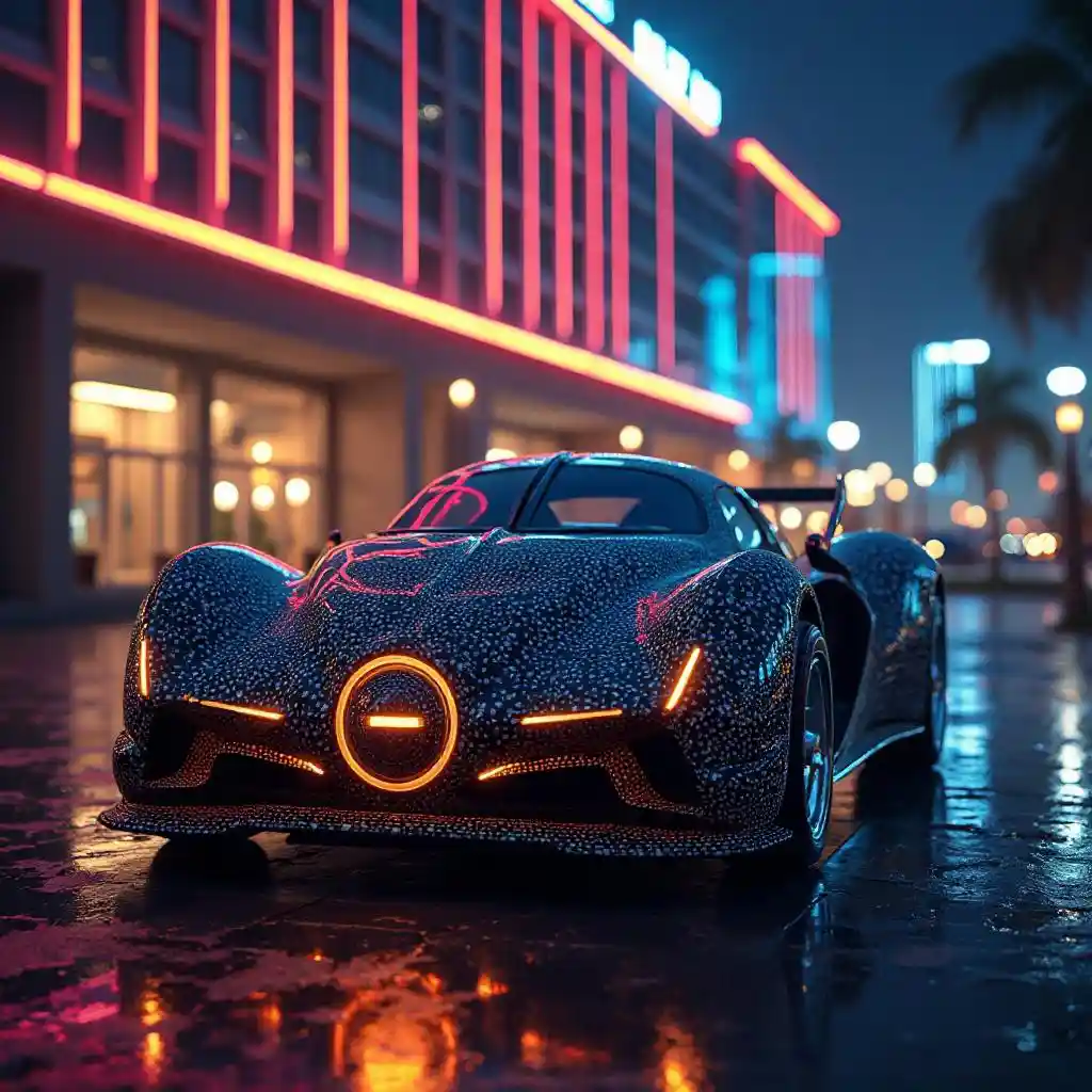ElijahLuodaan korkealaatuinen Bugati viimeisin malli edessä ylellinen hotelli neon valot taustalla