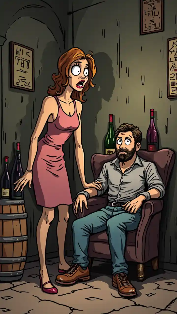 Juopunut ruma nainen, jossa on tynnyriä viiniä ja mies istuu, sarjakuva-tyyli