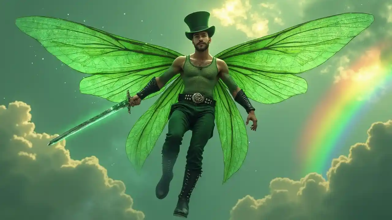 -Hypermaskuliini mies. Keltiläisiä. -Taidotarta. Lyhyt ja paksu, mutta hyvin rakennettu. Levyä olkapäätä, leveää rintaa ja kapeaa vyötärää. Tasa-alainen iho, kiiltävät jade vihreät silmät. Hyvin lyhyt tummanruskea tukka, yleensä hiottu/kammutettu selkä vihreä sametillinen hattu pään päällä. Kaunis kasvo, karkea ilme. Vahva kulma ja leuka, tummanruskea karva kasvoilla. Hänellä on puhdas vihreä kalaverkkokortti, jossa on pyöreät mallit, jotka ovat eri vihreiden sävyjen muotoja. Musta nahka, musta vyö. Vyöllä on valtava vihreä smaragdivyö. Vihreät farkut, jalkat korkeissa mustissa nahkaskoissa hopealla. Hänellä on pari suurta, yli-suuri lohikäärmeen siivet, vihreä ja läpinäkyvä - hän käyttää niitä lentää. Hän loistaa kiiltävällä vihreällä auralla ja jättää jälkiä kiiltävästä vihreästä keiju pölystä minne hän menee. Se vilkkuu kuin tähdet. Hänellä on hehkuva hopeinen lyhyt miekka, jonka kahva on koristeltu smaragdeilla. Koko kehon pose, pilvien läpi lentäminen, sateenkaari taivaalla.