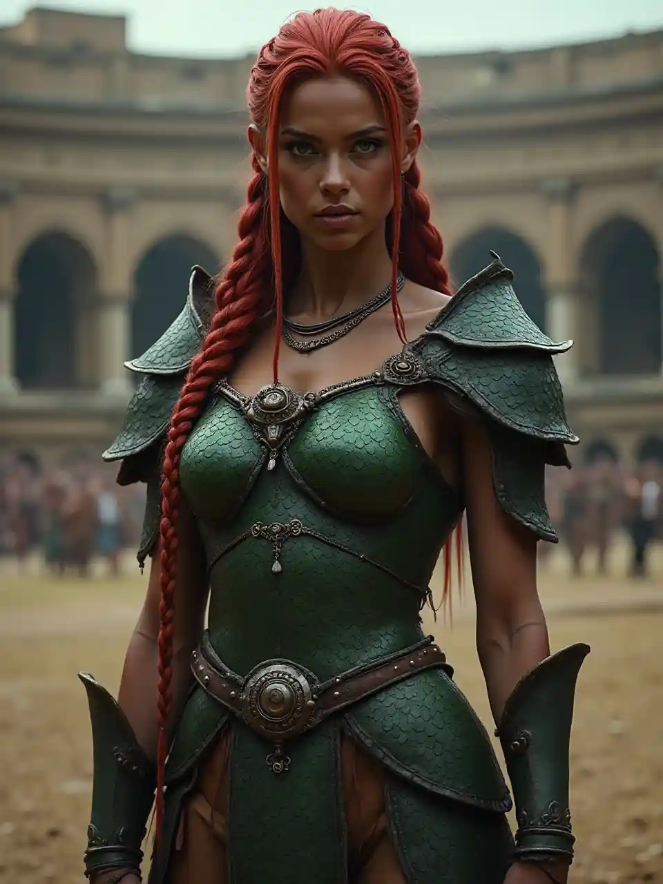Pitkä, kaunis, kelttiläinen ihmis. Hänellä on pitkän punaisen vikingityylin hiukset, lävistävät siniset silmät ja tumma iho. Hänellä on tummopuolikas rynnäkkö. Hän seisoo gladiaattori-koloseumissa.