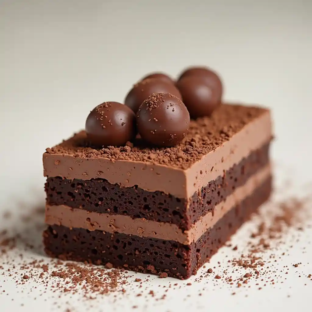 ScottPieni suklaakakku, jossa on tryffelinkirmaa, jossa on kolme pientä suklaapallota, joissa on kaakaopulvia, kolme kerrosta, realistinen, herkullinen, sokeri vaalealla taululla