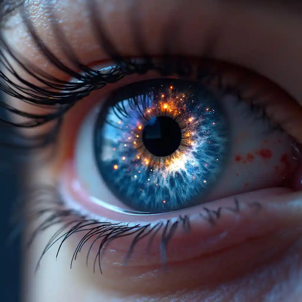 Hyperrealistinen lähikuva ihmissilmästä, joka tuijottaa suoraan kameraan. Koko iiris muuttuu henkeä vievään kosmiseen. Silmä näyttää elävältä ja kuvaa kaikki yksityiskohdat: terävät silmäripset, ihon luonnollinen rakenne ja pienet valon heijastukset. Silmä ei ole perinteisen nurmikon muoto, vaan se sisältää laajan, yksityiskohtaisen maailman, jossa on pyörimässä olevia tähtisumia, hehkuvia taivaallisia pilviä, kaukaisia galakseja ja säihtyviä tähtiä. Useat kirkkaat komeetat kulkevat kosmisen läpi ja jättävät jälkeensä sinisiä, valkoisia ja kultaisia valoa. Niiden liikkeet lisäävät dynaamista syvyyttä, mikä saa kosmisen tuntumaan elävältä. Silmän värit vaihtelevat syväsinistä, elävistä violetti, kirkkaista vaaleanpunaisista ja kultaisia kohokohduksia, jotka muistuttavat avaruuden valokuvaa. Oppilas näyttää voimakkaalta mustalta tyhjyydeltä, joka muistuttaa miniattua mustaa aukkoa, joka hienovaraisesti taittaa valon reunoilleen. Silmän valkoisella osa-alueella on realistiset suonet ja luonnollinen kosteuskiiltävyys, mikä lisää fotorealismia. Heikko kosminen valo heijastuu ympäröivään ihoon. Se sulautuu hienovaraisesti ihmisen muotoon ja avaruuden. Kuvattu Sony A7R IV + 100 mm makro f/2.8, 8K-määritys, äärimmäinen tarkkuus, HDR, elokuvavalaistus, jossa on täysi keskittyminen silmiin, kun ympäröivät elementit pysyvät pehmeinä luonnollisen syvyyden vaikutuksen vuoksi.