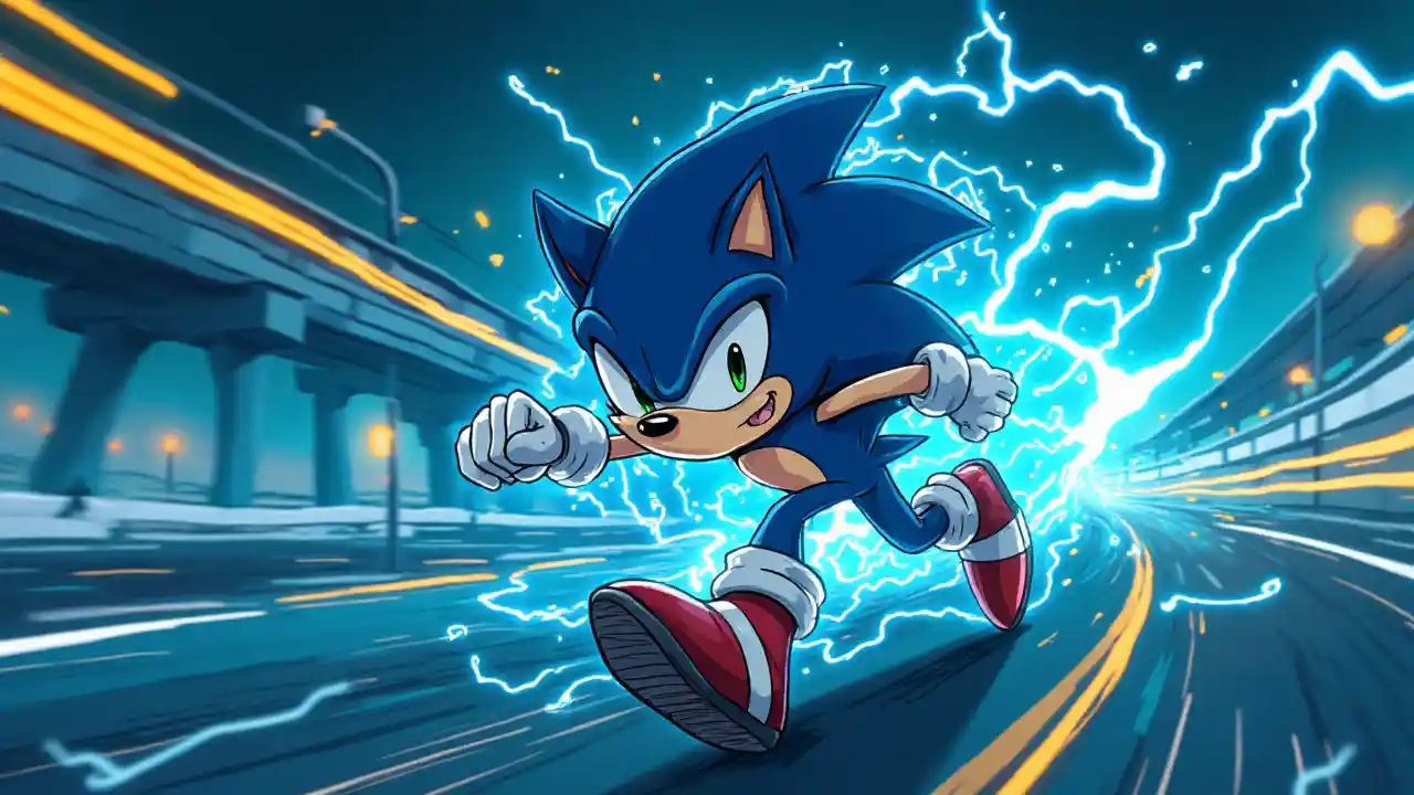Sonic, eräs aito juoksee moottoritiellä. Hänen ruumiistaan paistaa sinisiä salamaa. Värinähden hallitsevat siniset, tummat siniset ja tummat keltaiset, jotka antavat kuvalle vaikuttavan, eepisen ilmapiirin. Tämä kuvaus on innostu cyberpunkista tai sci-fiction estetikasta.