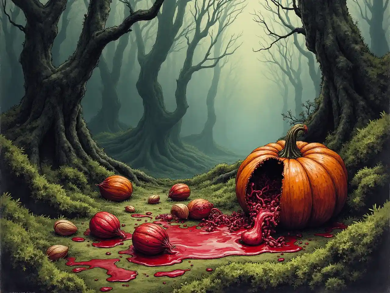 (Toscale, kurpitsan siemenet) on hajallaan ja osittain peitetty tummapunaisella nesteellä ja sotkeutuneella massoilla, jotka lepäävät mohkevassa metsälajassa matala pyöräilevä sumu. Ympärillä olevat puut ovat kieroutuneita ja paljaita, ja ne katoavat synkkään taustaan. :: pimeän fantasian kauhuelokuva :: mustetta ja grafiittiluonnetta :: (kätketty ilme)) Gerald Bromin, Ian Millerin, Zdzisław Beksińskin