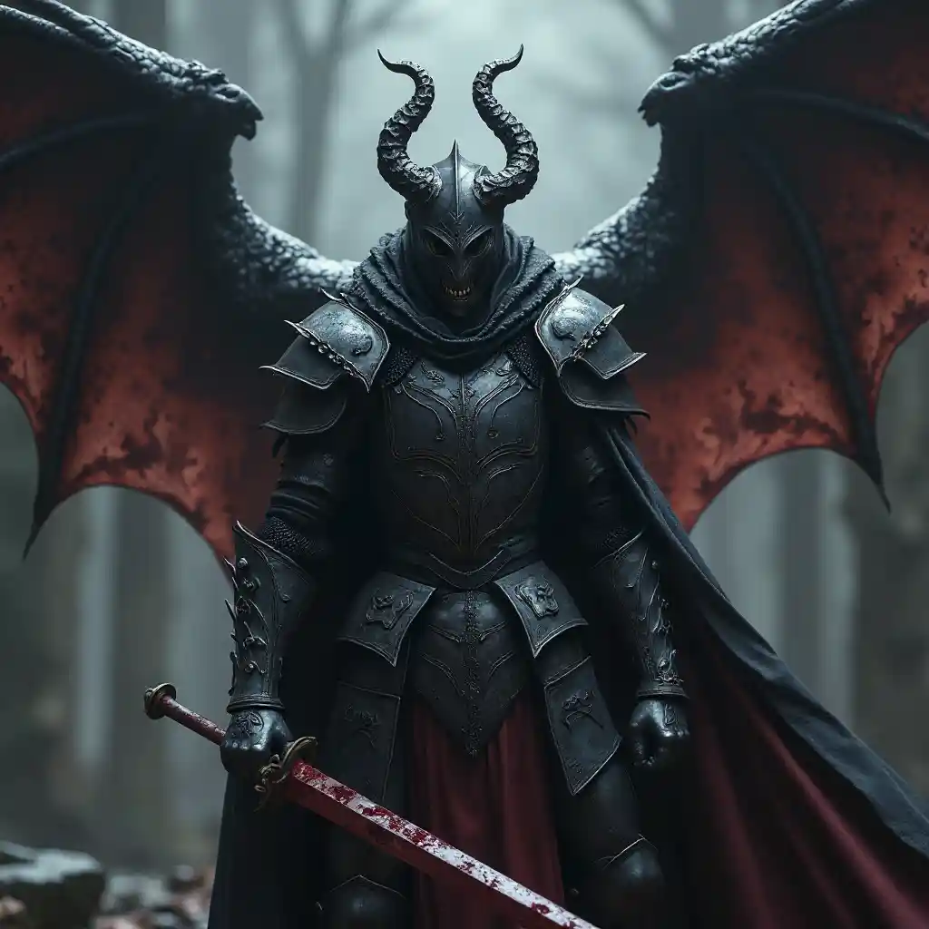 Pimeä ritarikunta, lohikäärmeen veri hänen haarnissaan, koko vartalon, tyylillä julisteita, keskiaikaista, monimutkaista, tummanharmaa realistista, 4K, suhte 16/9, elokuva 200mm